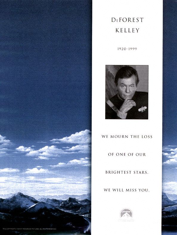 June 11, 1999 is a date Star Trek fans will never forget. On that date, DeForest Kelley, best known as the cantankerous yet lovable Dr. Leonard H. "Bones" McCoy from the original Star Trek television series and first six Trek movies, passed away at age 79.
